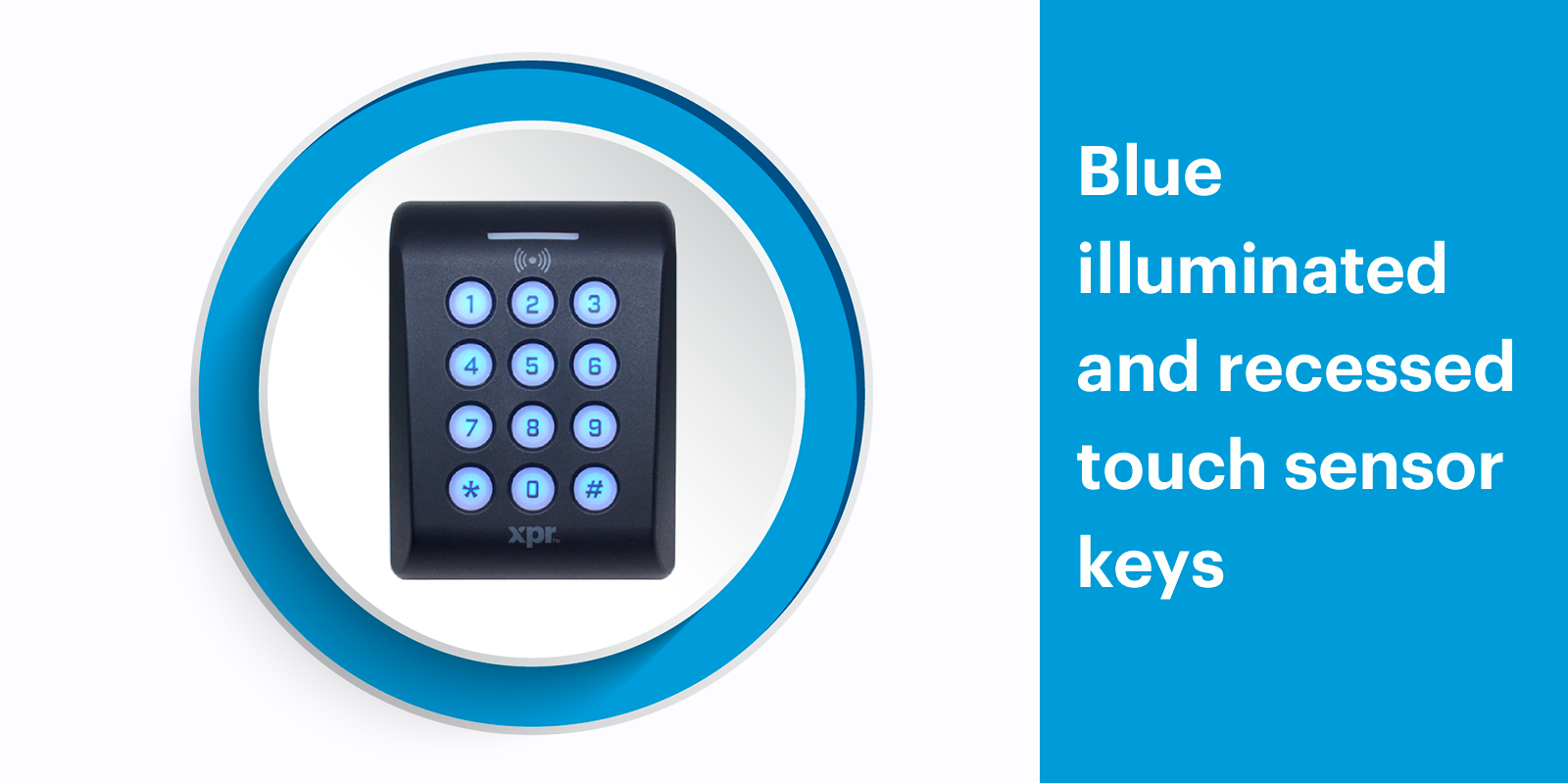 The XP-K is a blue backlit keypad. When the code or card is presented, the top LED of the keypad changes from blue to green when access is allowed or red when it is denied. The blue backlight keypad flickers without changing colour with each key press, indicating that the keypad is connected (idle mode).